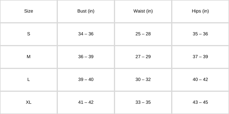 Size Chart (In Inches):