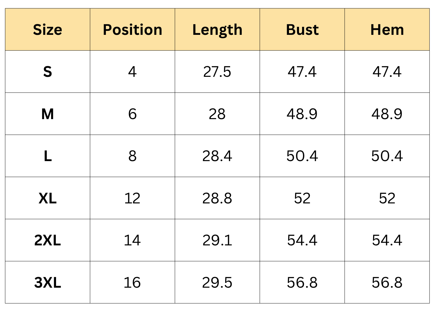 Size Chart (Inches):