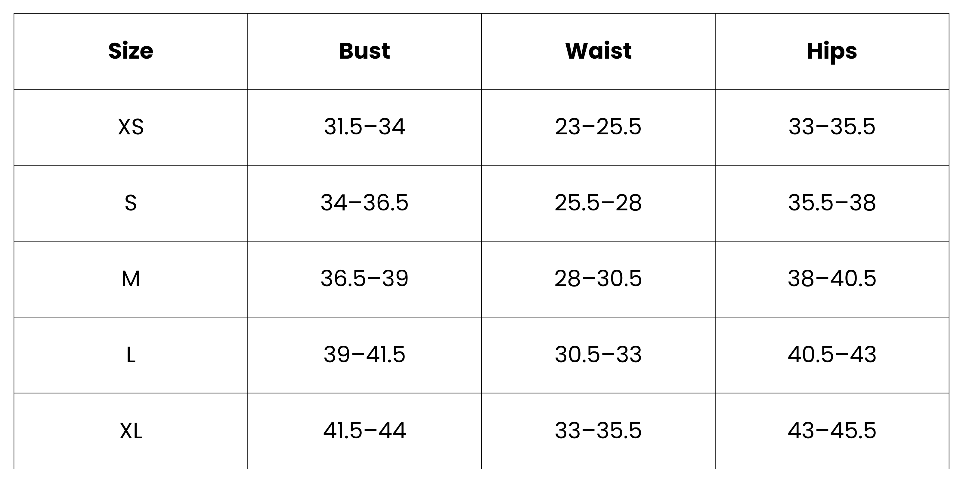 Size Chart (inches):