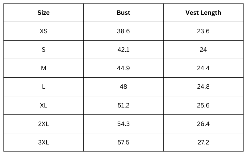 Size Chart (inches):