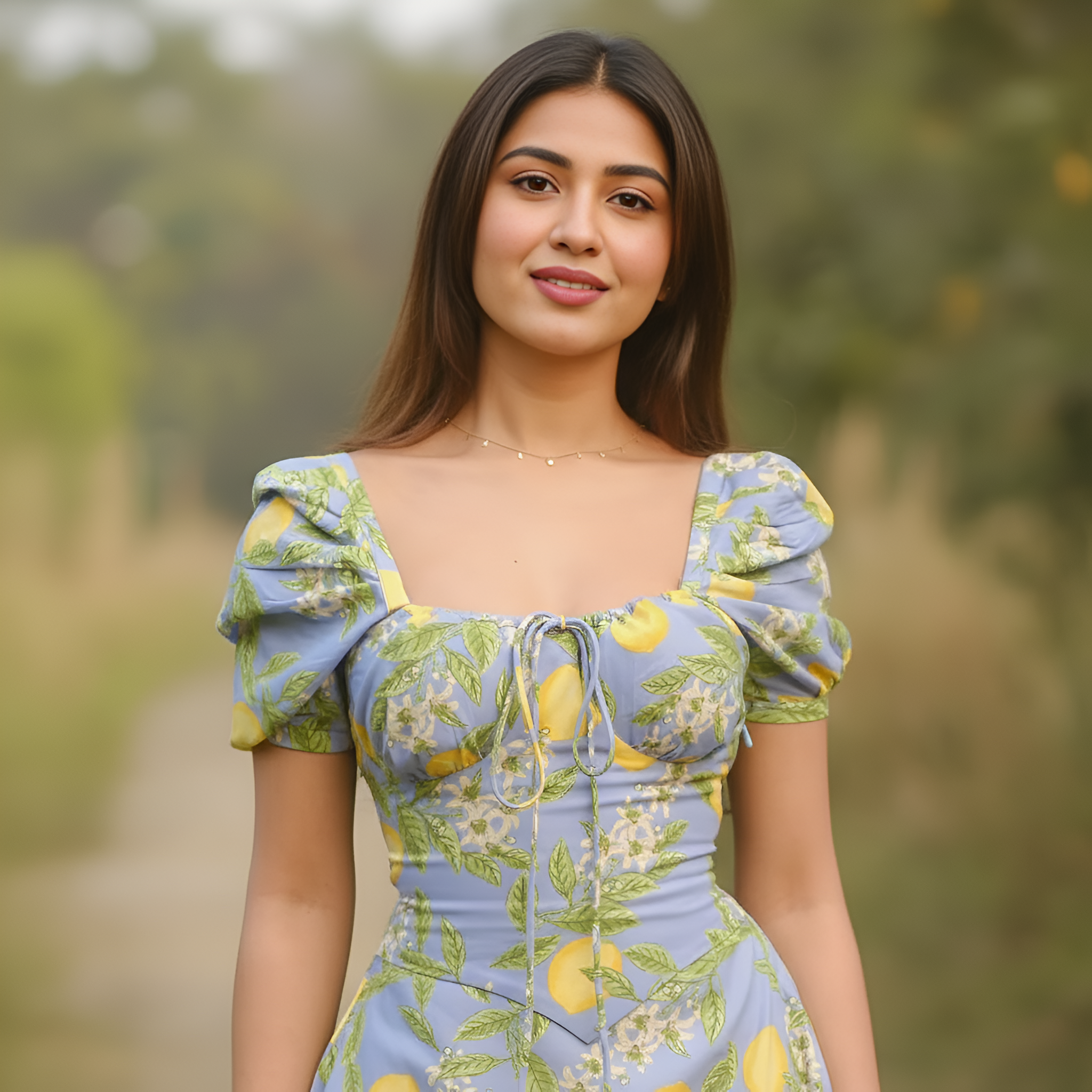Lemon Printed Midi Dress With Puff Sleeve Detail For Women combines comfort, vibrant design, and effortless style, making it a perfect choice for seasonal wear and everyday elegance. Lemon Print Midi Dress is a lightweight and stylish outfit designed for warm weather. Featuring a vibrant lemon print, puff sleeves, and a flattering fit and flare shape, it offers comfort and elegance. Ideal for casual outings, vacations, and summer events, this dress combines airy fabric with a design, making it a versatile wardrobe choice.