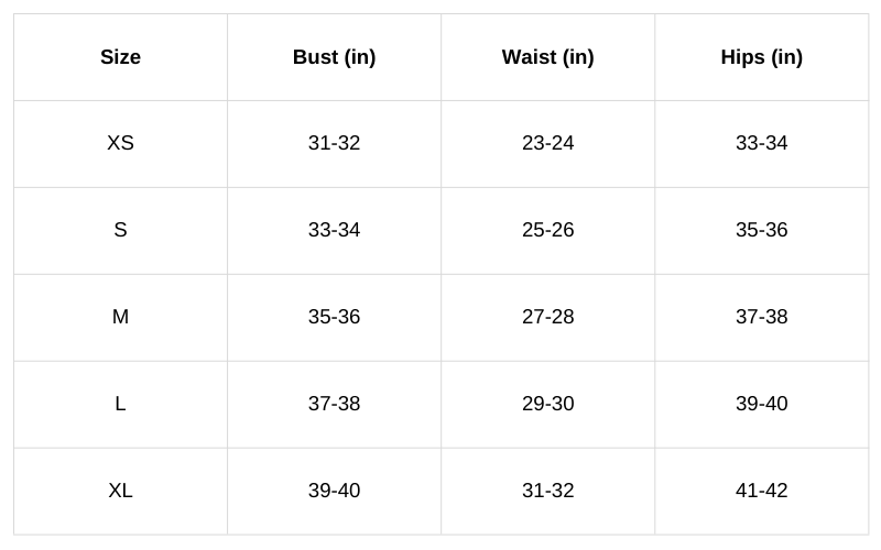 Size Chart (Inches):