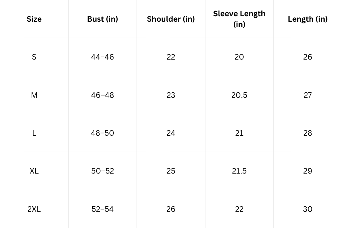 Size Chart (Inches):