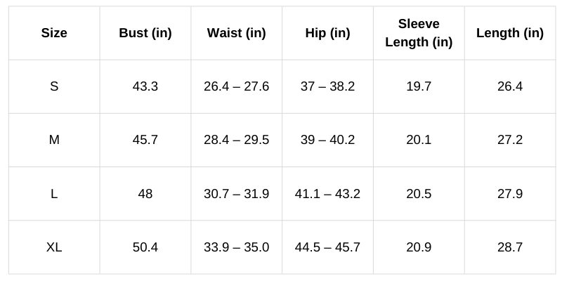 Size Chart (Inches):