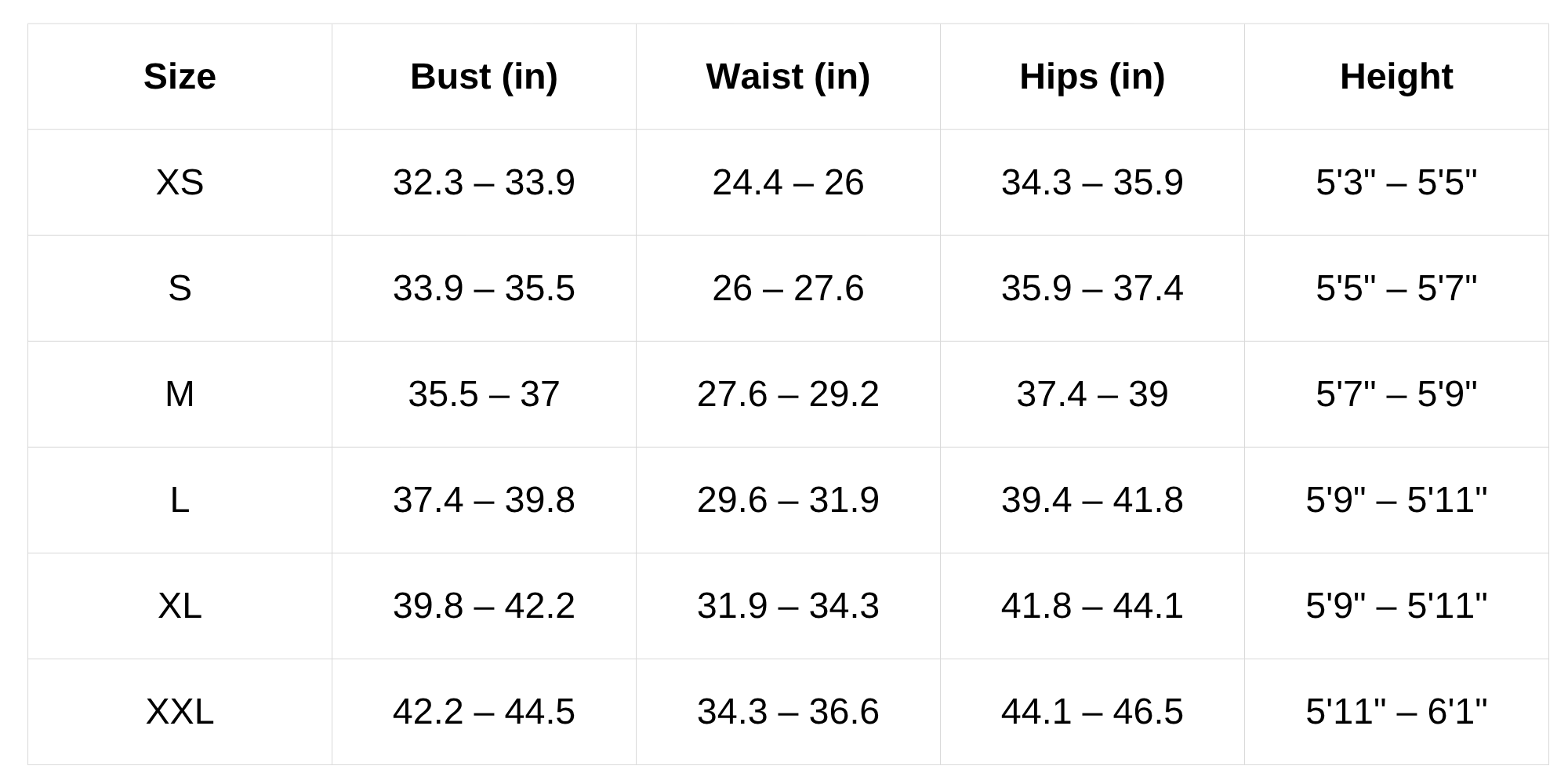 Size Chart (Inches):